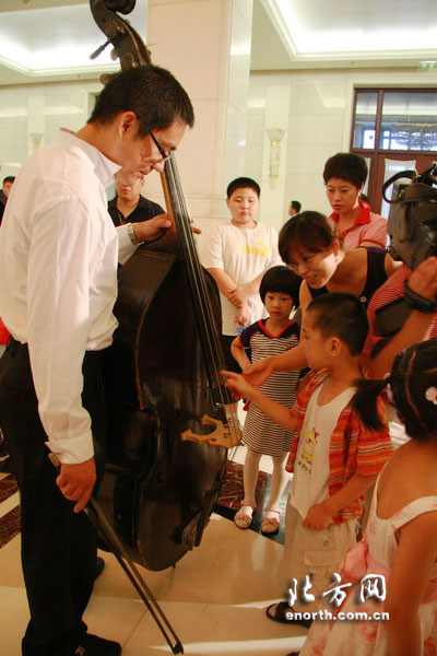 记者在现场看到,很多家长都提前带着孩子进场近距离地“触摸乐器”。这些孩子有的从两三岁起就开始学习音乐,还有的孩子第一次这样近距离的接触乐器。他们用好奇的目光仔细打量着这些神奇的乐器,不时地伸手摸一摸。一位老奶奶告诉记者,她是带着外孙女来看音乐会的,孩子很喜欢音乐,这次“打开音乐之门”系列活动给孩子们创造了一个很好的环境,可以让她更加形象地具体的了解乐器,感受音乐。
