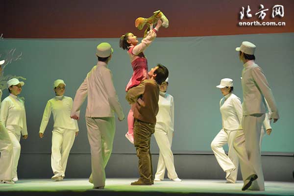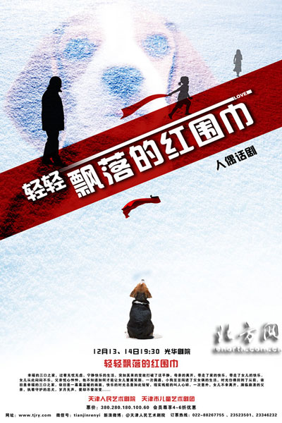 《轻轻飘落的红围巾》由著名导演马路执导,讲述了一个幸福的三口之家,却因母亲的故去而失去了原本的宁静快乐,但小狗豆豆的偶然闯入,为父女俩带来了新的生机,可女儿却因豆豆遭遇不幸,一边是濒临崩溃的父亲,一边是执著守护的忠犬,心结在无声的岁月中越发纠结。全剧充满浓浓的诗意,将话剧、音乐剧、人偶同台融为一体,唯美、纯净的白色舞台将所有撕心裂肺、有浅吟低唱,张力四射的情绪娓娓道来。此外,该剧真人与真人、真人与木偶、木偶与木偶演对手戏,呈现出另类的舞台形式与舞台意向,极大地体现了演员高超的技艺和素养。