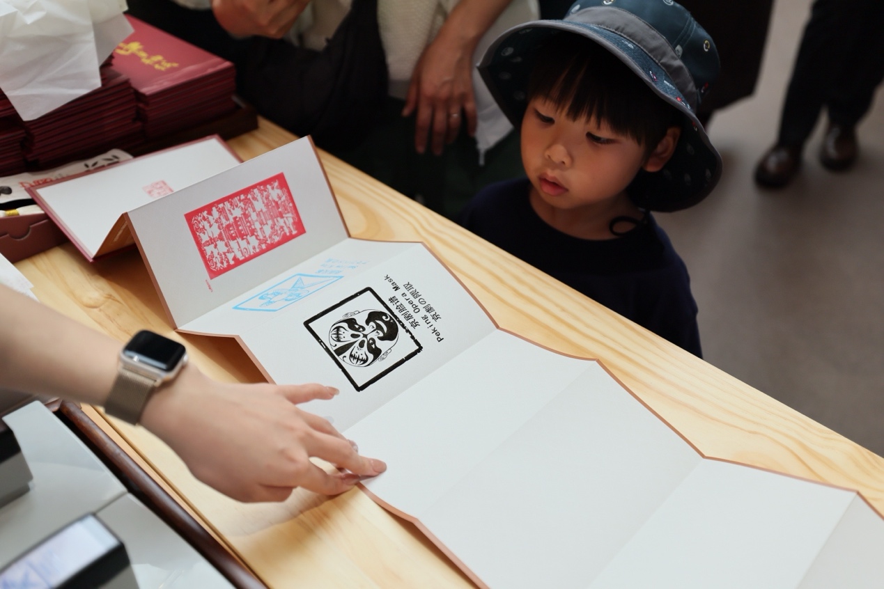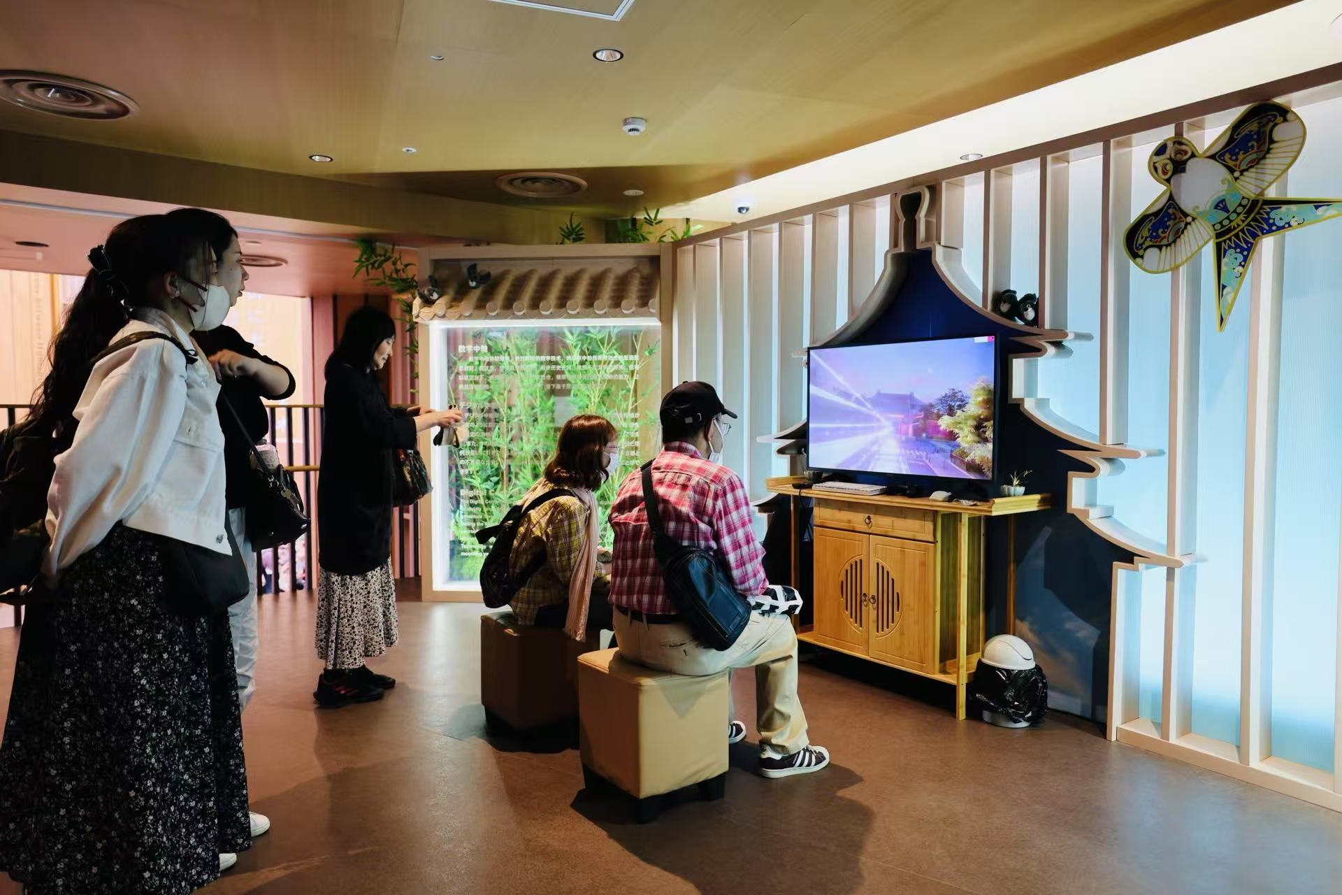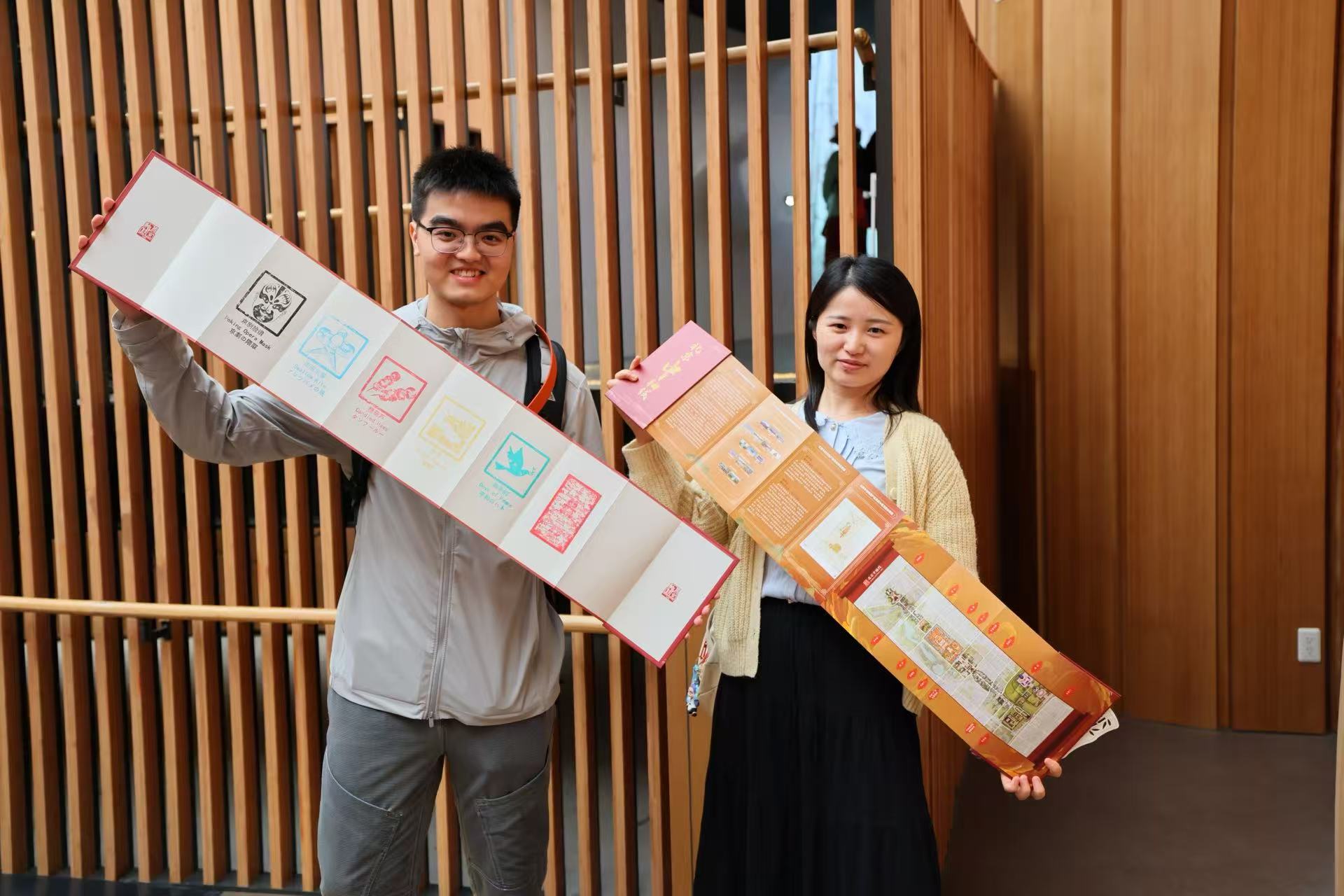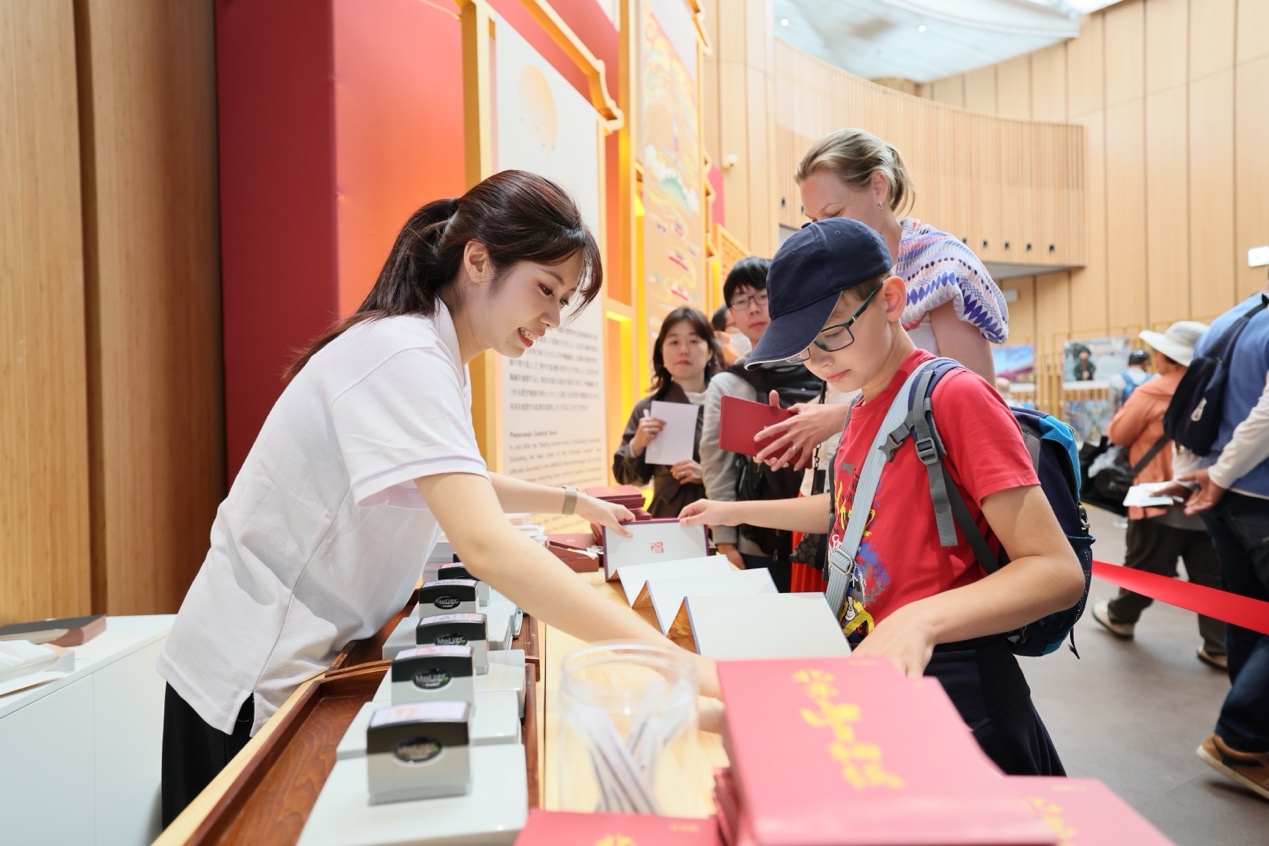 在全景中轴展区,北京中轴线上的山水画卷缓缓展开,带领观众领略着历史故事、探寻着人与自然和谐共处的智慧。在现场,最热闹的当属“打卡集章”环节,中轴线上的文化元素被设计成独具特色的印章,观众们纷纷排起长队期待完成“盖章”的仪式感。来自大阪的“集章爱好者”山田先生兴奋地拿着他手中刚刚盖好的图章,表示“一定要收藏好这份非常具有纪念意义的图章,并让更多人知道北京还有这么美的文化遗产!”