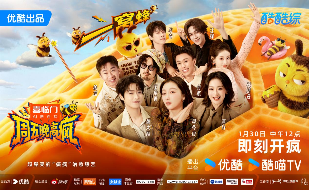由优酷出品、喜临门独家冠名的超爆笑的“癫疯”治愈综艺《周五晚高疯》已于1月28日官宣定档,今日中午12点节目先导片正式上线,2月6日起每周五中午12点更新(第一期上线),会员抢先看!付航、高叶、王传君、汪铎、魏大勋、杨迪、周冬雨、周奇、祝绪丹(按艺人姓名首字母排序)9位常驻艺人组成“bee疯糖”加盟。