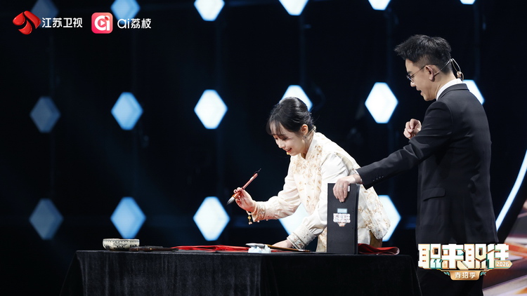 然而真正惊艳全场的,是她现场挥毫泼墨的四幅书法:楷书的稳健、行书的风骨、隶书的变革、篆书的文脉,分别送给四位面试官,每一幅都精准击中对方特质。面对养生堂的考题——设计一款中国护肤品策划方案,她从白桦树元素切入,构想森林系视觉、线下快闪SPA馆,虽被指出“需求优先于产品”,却也收获“没有定式反而可能更大”的肯定。